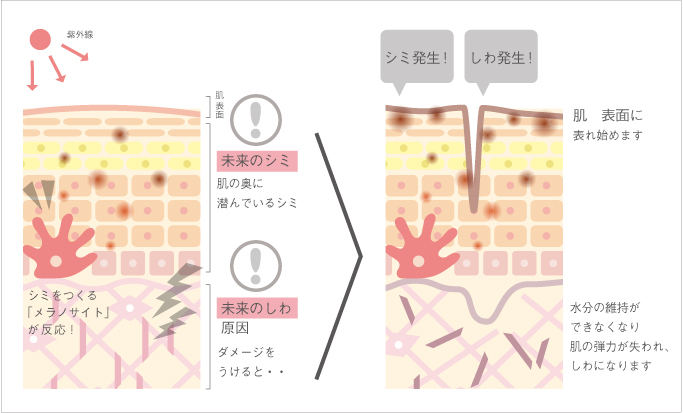 シミをつくる「メラノサイト」が反応し、肌の奥に潜んだシミをつくります。