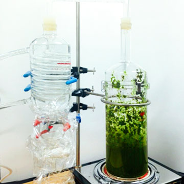 ラボにてクマタケランの葉と茎をすりつぶした圧搾汁を蒸留器にかけて蒸留水を製造しています。